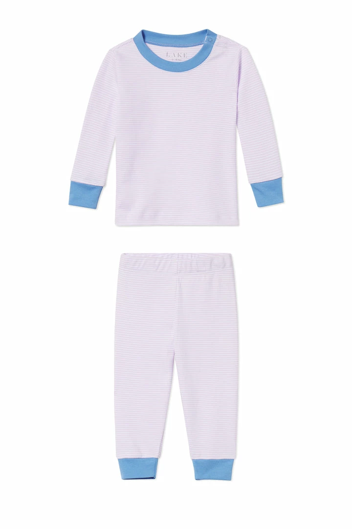 The Baby Long-Long Set in Lavender Fields, a soft purple micro stripe with cerulean blue trim, features a long-sleeve top with two functional snaps and pants with an elastic waist. Made from 100% Pima Cotton. This garment is not flame resistant. For the child’s safety, this garment should fit snugly.