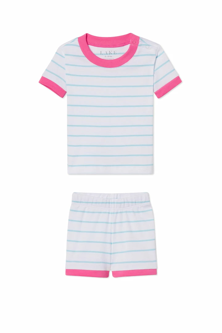 The Baby Shorts Set in Dulce, soft turquoise stripes with pink binding, features a short-sleeve top and shorts with an elastic waistband. Made from 100% Pima cotton. This garment is not flame resistant. For the child’s safety, this garment should fit snugly.