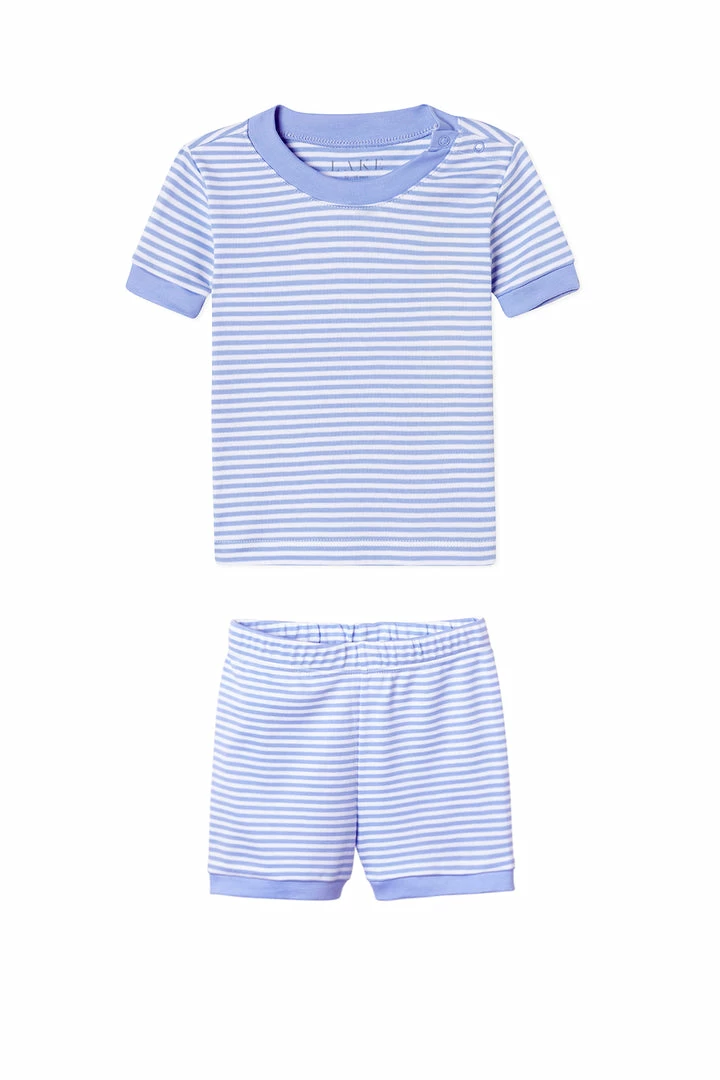 The Baby Shorts Set in Hydrangea, our best-selling purpley-blue, features a short-sleeve top with two snaps at the neck and shorts with an elastic waistband. Made from 100% Pima Cotton. This garment is not flame resistant. For the child’s safety, this garment should fit snugly.