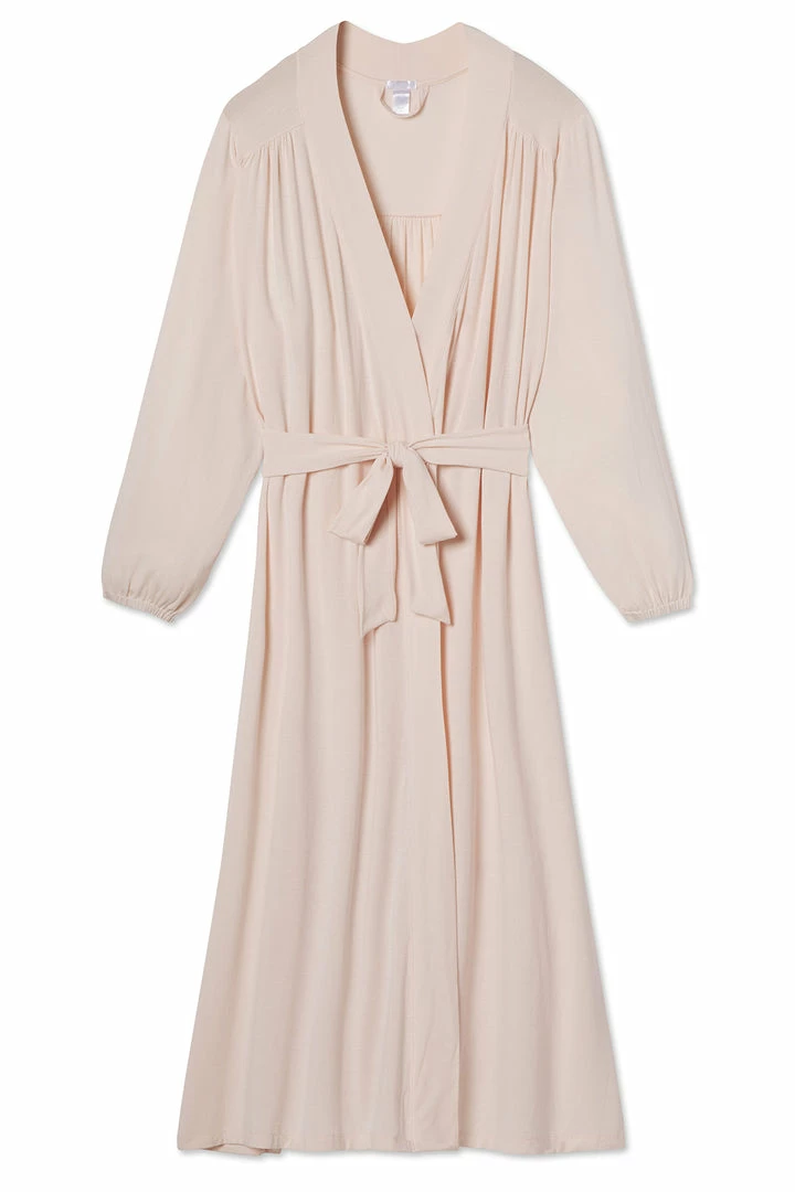 The DreamKnit Midi Robe in Peony, a blushing whisper of pink, is designed to fit like a vintage dressing gown with a buttery soft feel. This robe offers a hint of structure through its practical, stitched-in belt and interior tie. This robe features shapely, gathered details at the shoulder, and elasticated, full-length sleeves. A true midi length, this robe is meant to hit just above the ankles. Made of 95% modal, 5% spandex.