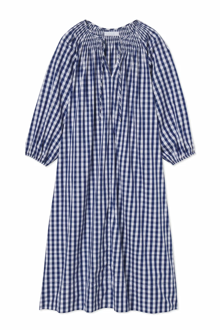 The Hammock Midi Dress in Navy Gingham features smocking and ties at the neck and elastic, bracelet-length sleeves. Designed to fit loose through the waist and body, the dress is a midi length with a 5″ hem. Made of 100% cotton poplin.