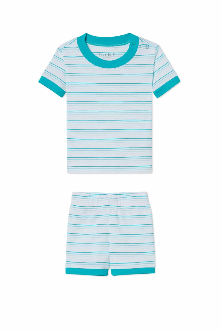 The Baby Shorts Set in Tuquoise Ombre, turquoise gradient stripes on white with turquiose binding, features a short-sleeve top with two snaps at the neck and shorts with an elastic waistband. Made from 100% Pima cotton. This garment is not flame resistant. For the child’s safety, this garment should fit snugly.