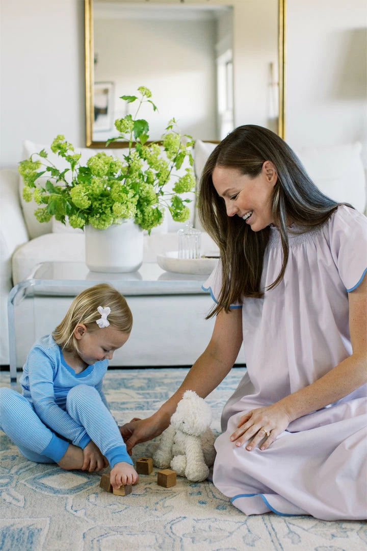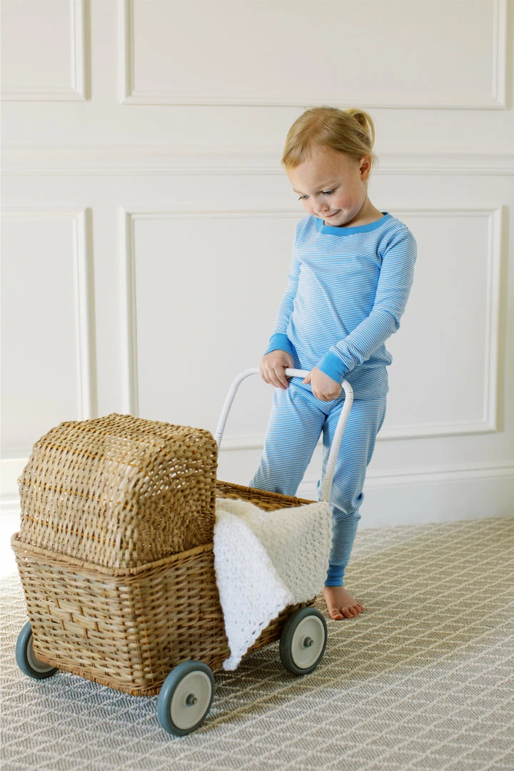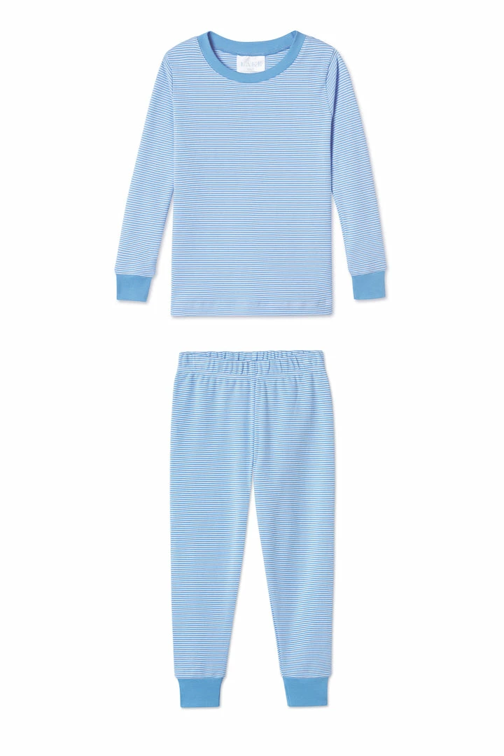 The Kids Long-Long Set in Cornflower, a soft blue micro stripe, features a long-sleeve top and pants with an elastic waistband. Made from 100% Pima cotton. This garment is not flame resistant. For the child’s safety, this garment should fit snugly.