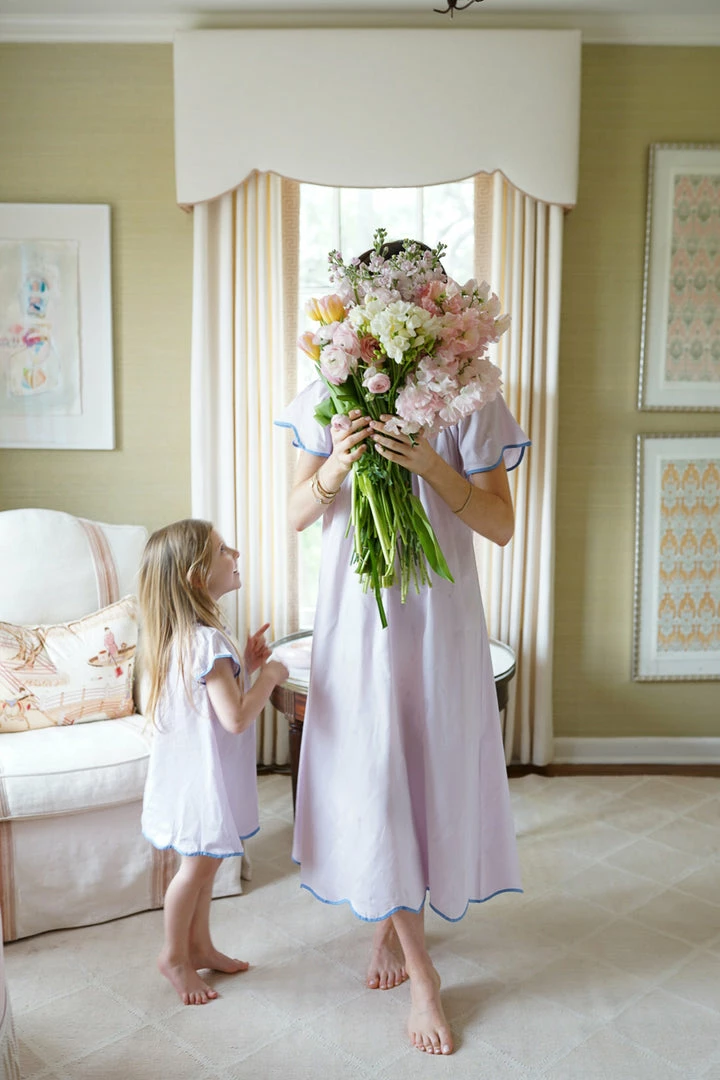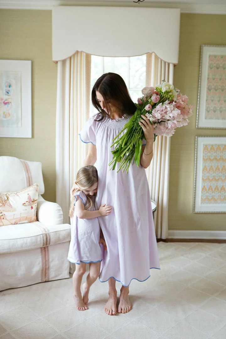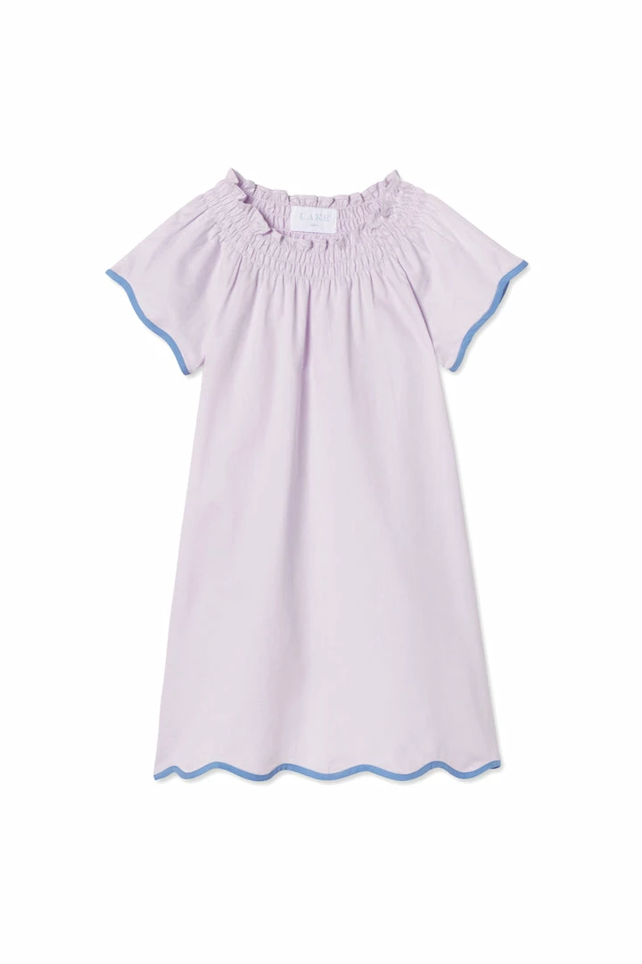 The Kids Patio Dress in Wild Flower, the softest lavender hue with pale blue piping, is unlined and features a smocked neckline with a scalloped hem and sleeves. Made of 100% cotton poplin.