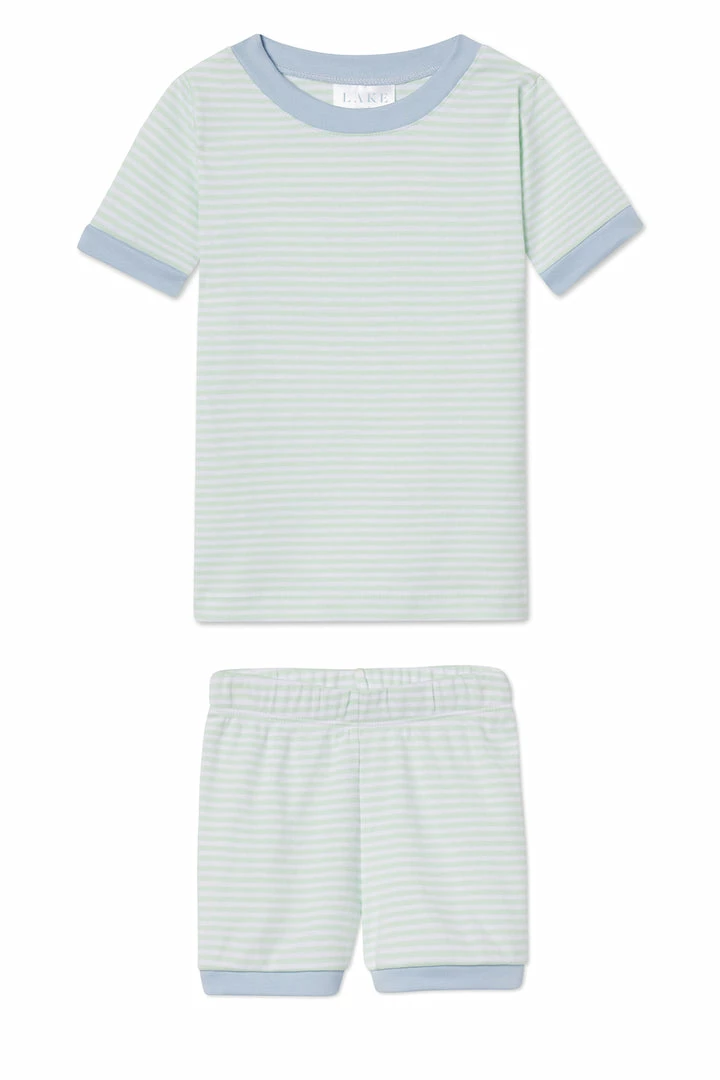 The Kids Shorts Set in Frisbee, with mini mint stripes and a pale blue trim, features a short-sleeve top and shorts with an elastic waistband. Made from 100% Pima cotton. This garment is not flame resistant. For the child’s safety, this garment should fit snugly.