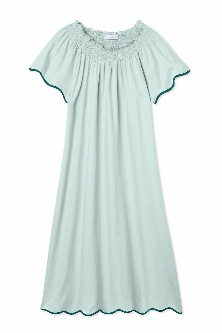 The Patio Midi Dress in Spruce, a cool, muted green, is an unlined dress featuring a smocked neckline with a scalloped hem and sleeves. It’s crisp and breezy and designed to hit above the ankle for ultimate comfort. Ease into the day in this frock at a family gathering, to run errands, or lounge at home. Made of 100% cotton poplin.