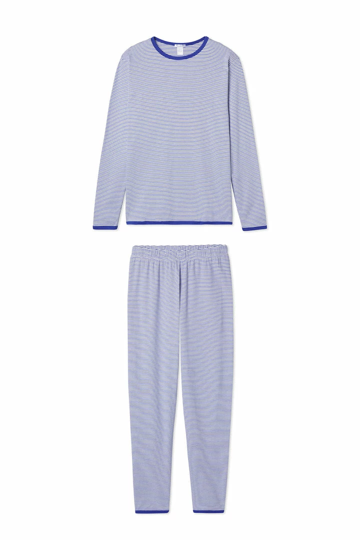 The Pima Long John Set in Lapis, a blue-on-blue gradient, features a long-sleeve crewneck top and pants with an elastic waistband. The pants are slimmer and more form-fitting than our original pajama pants. Made from 100% Pima cotton.