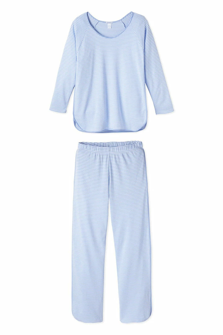 The Pima Long-Long Set in Hydrangea, our best-selling purpley-blue, features a three-quarter sleeve scoop neck top and pants with an elastic waistband. Made from 100% Pima cotton.