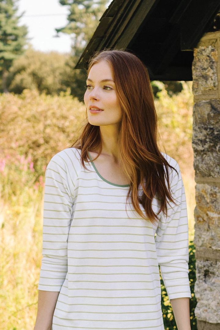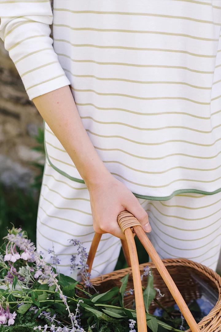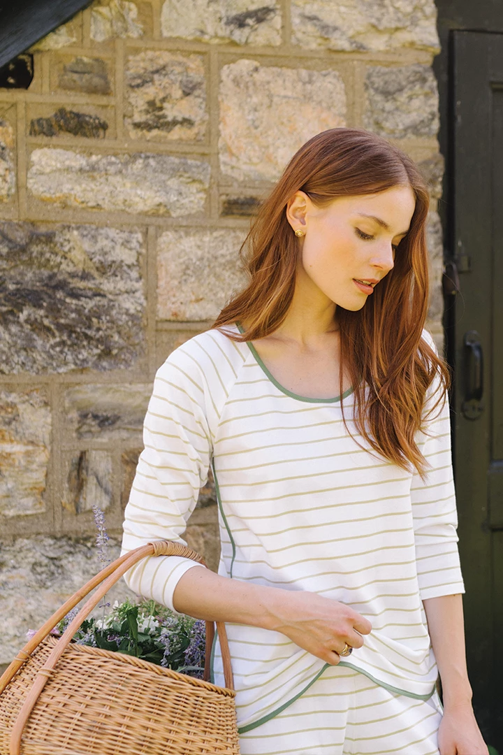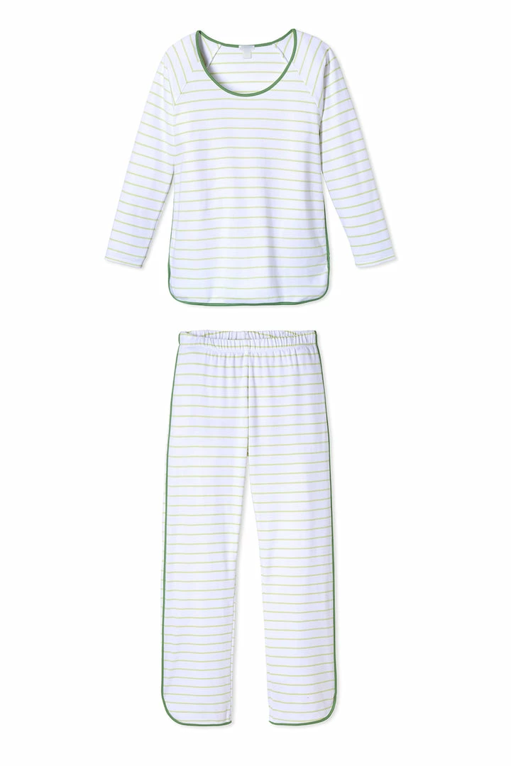 The Pima Long-Long Set in Vine, a grass-green micro stripe with coordinating piping, features a three-quarter sleeve scoop neck top and pants with an elastic waistband. Made from 100% Pima cotton.