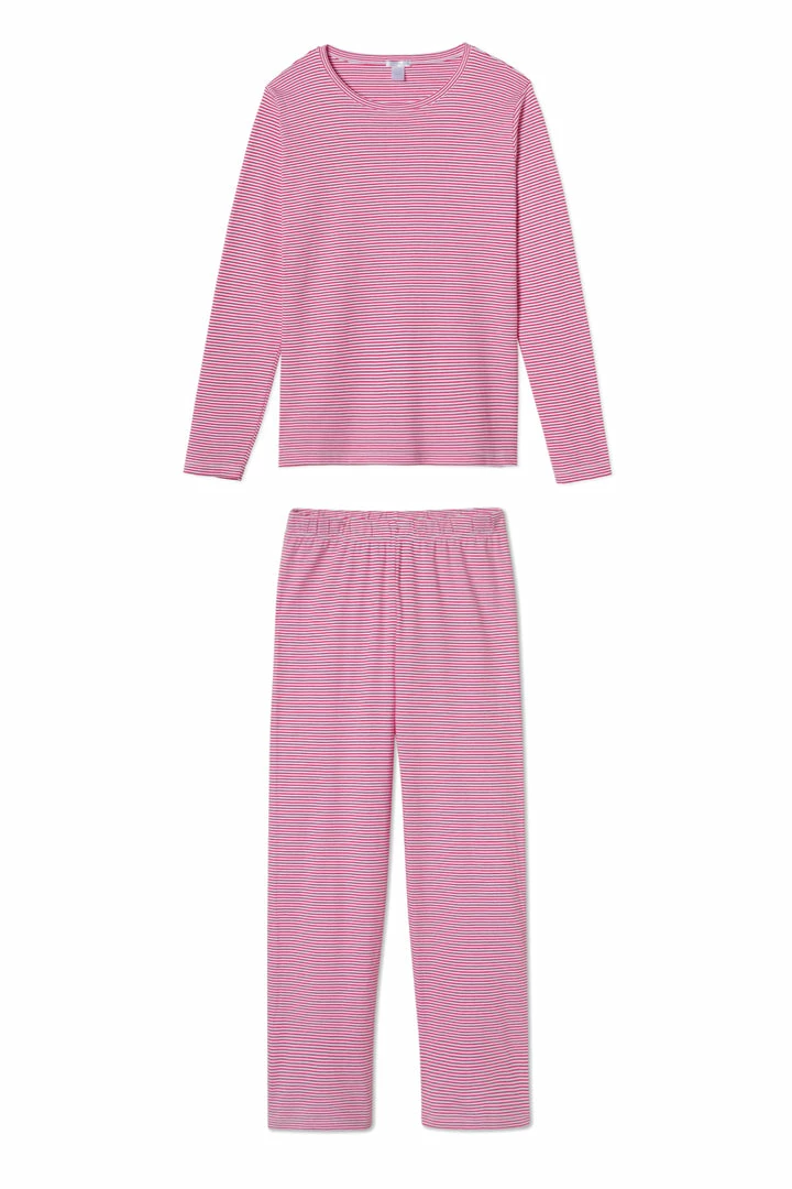 The Long-Long Weekend Set in Classic Red, a timeless, cherry-inspired hue, features a fitted, long-sleeve crewneck top. The pants are high-waisted with an elastic waist and straight-edge hem. Made from 100% Pima Cotton.