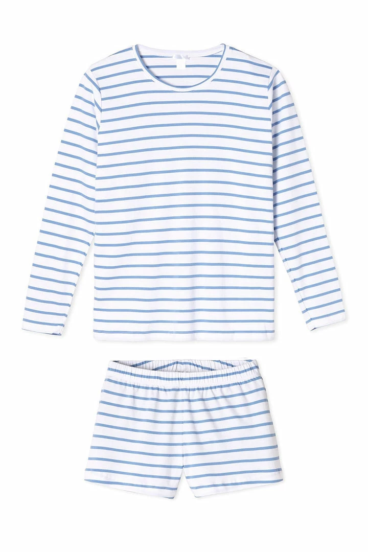 The Pima Long-Short Weekend Set in Bistro, a classic blue stripe, features a long-sleeve crewneck top and shorts with an elastic waistband and 3″ inseam. Made from 100% Pima Cotton.