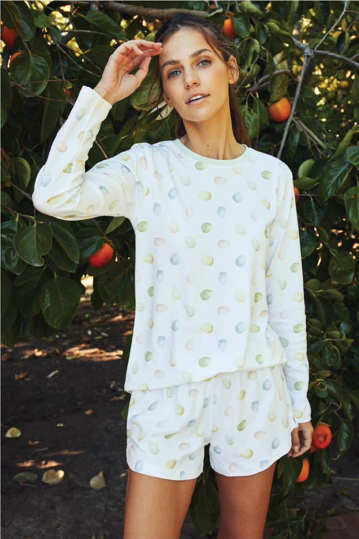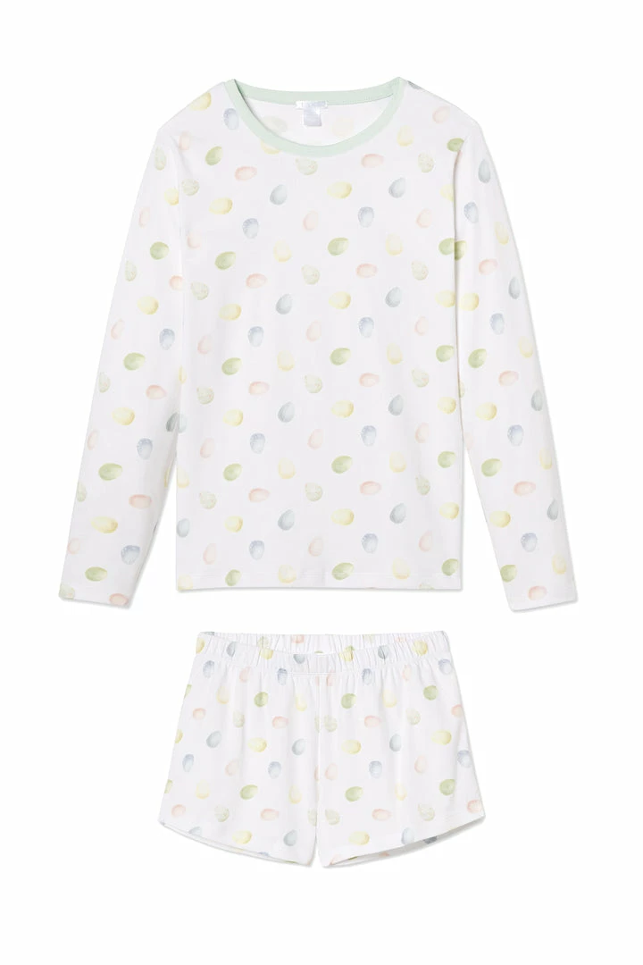 The Pima Long-Short Weekend Set in Hatch, an Easter print featuring eggs rendered by artist Inslee Farris, features a long-sleeve crewneck top and shorts with an elastic waistband and 3″ inseam. Made from 100% Pima Cotton.