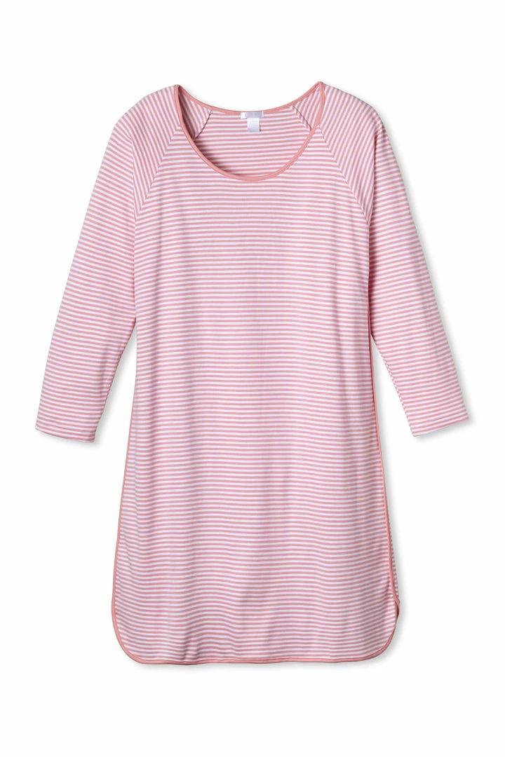 The Pima Long Sleeve Nightgown in Posy, soft coral stripes, features a scoop neck, three-quarter length sleeves, and is designed to hit at the knee. Made from 100% Pima cotton.