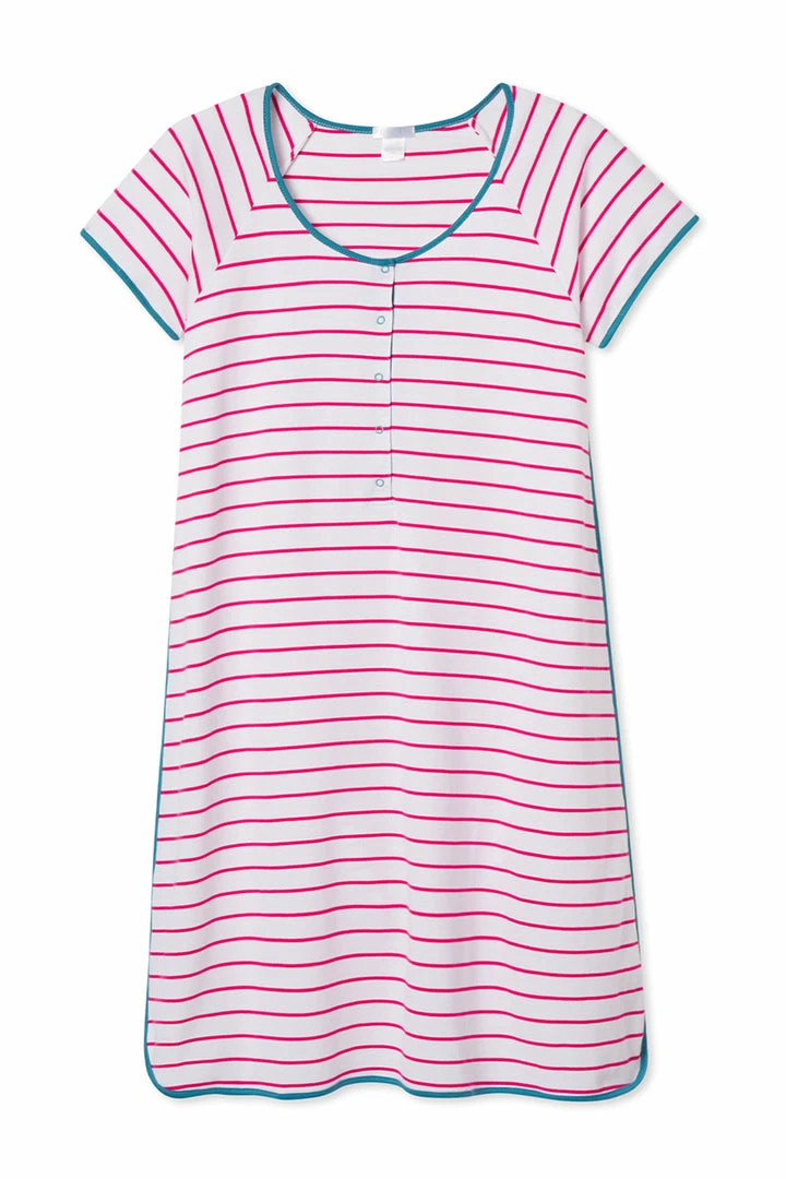 The Maternity Nightgown in Ruby, a pinky-red stripe with a deep teal contrast binding, features a short-sleeve scoop neck with nursing-friendly snaps and room for a bump. It’s ideal for pregnancy and post-delivery. Made from 100% Pima cotton.