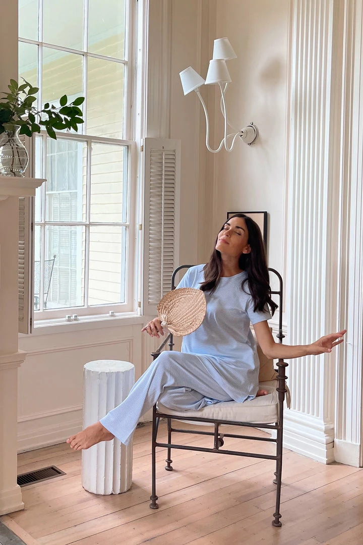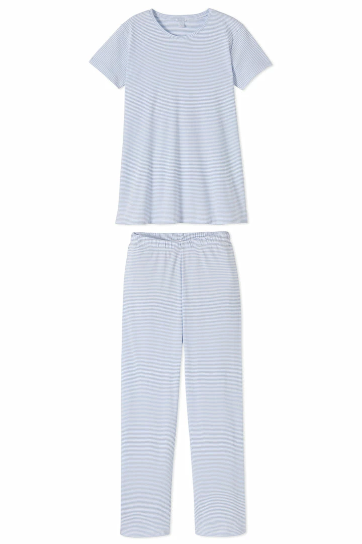 The Maternity Short-Long Weekend Set in French Blue,  a soft, striped shade inspired by Provençal ceramics, features a roomy short-sleeve crewneck top fit for a bump and pants with an elastic waistband. It’s perfect for pregnancy and post-delivery. Made from 100% Pima Cotton.