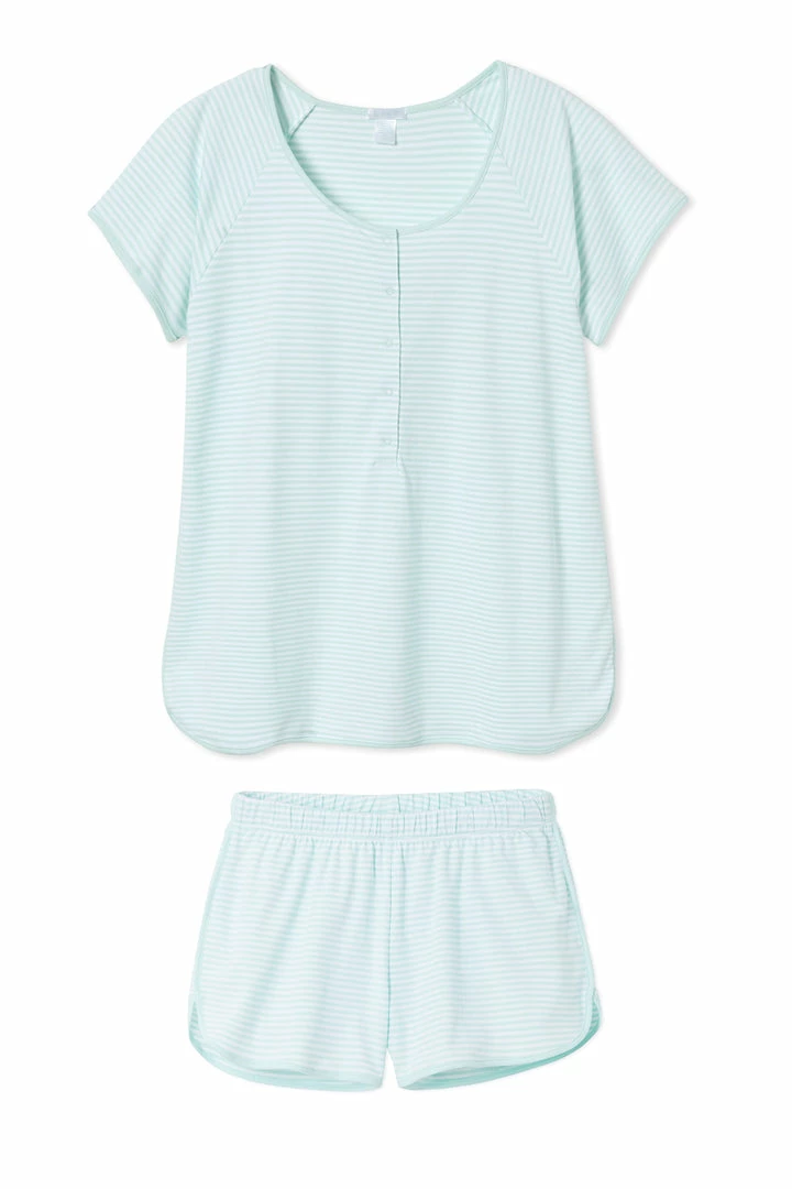 The Maternity Short-Long Set in Pool, a cool blue hue, features a short-sleeve scoop neck top with nursing-friendly snaps and room for a bump. The shorts have an elastic waistband. It’s ideal for pregnancy and post-delivery. Made from 100% Pima cotton.