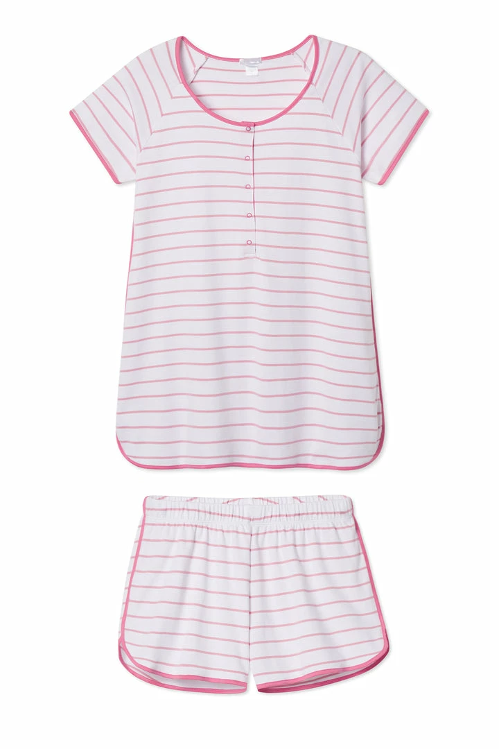 The Maternity Short-Long Set in Rose, a soft yet saturated pink, features a short-sleeve scoop neck top with nursing-friendly snaps and room for a bump. The shorts have an elastic waistband. It’s ideal for pregnancy and post-delivery. Made from 100% Pima cotton.