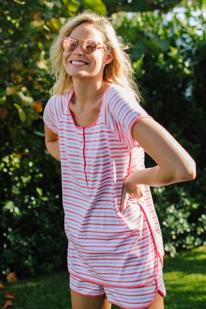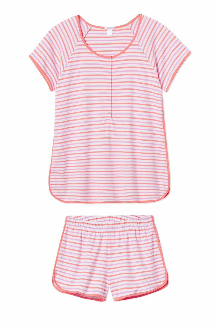 The Maternity Short-Long Set in Tiki, a pink and coral stripe on white with coral trim, features a short-sleeve, scoop-neck top with nursing-friendly snaps and room for a bump. The shorts have an elastic waistband. It’s ideal for pregnancy and post-delivery. Made from 100% Pima cotton.