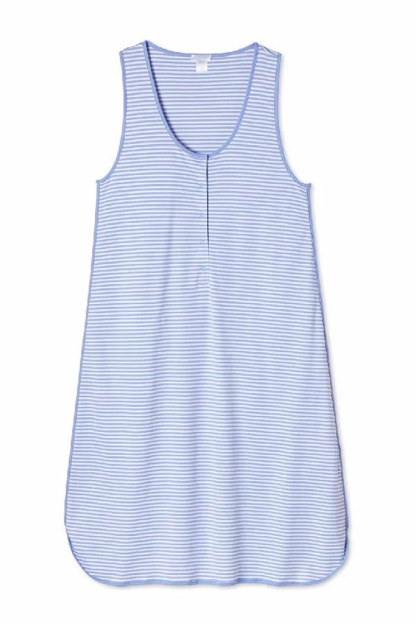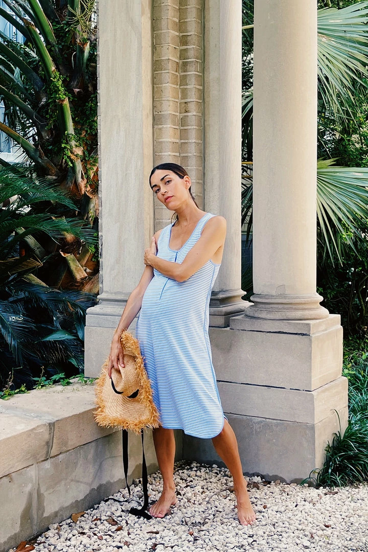 The Maternity Tank Gown in Hydrangea, our best-selling purpley-blue, features a sleeveless scoop neck with nursing-friendly snaps and room for a bump. It’s ideal for pregnancy and post-delivery. Made from 100% Pima cotton.