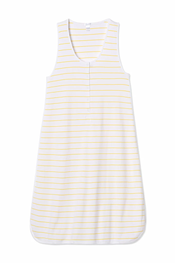 The Maternity Tank Gown in Lemon, fresh squeezed stripes in citrus-yellow, features a sleeveless scoop neck with nursing-friendly snaps and room for a bump. It’s ideal for pregnancy and post-delivery. Made from 100% Pima cotton.