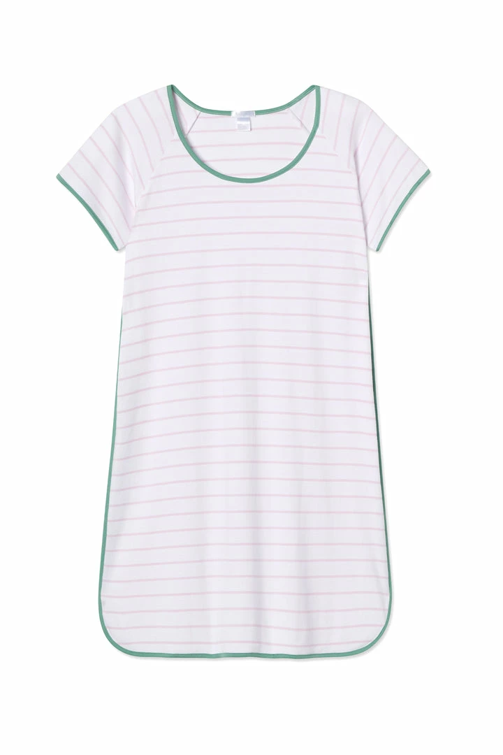 The Pima Nightgown in Iris, a lavender stripe with contrast green piping, features a short-sleeve scoopneck and a slight A-line silhouette. Made from 100% Pima cotton.