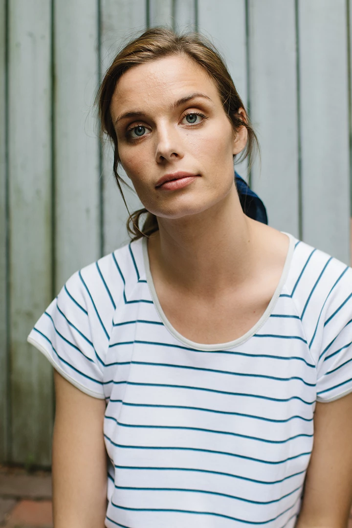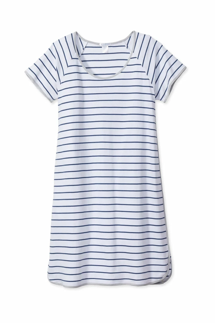 The Pima Nightgown in Vintage Indigo, a navy stripe with a cool gray trim, features a short-sleeve scoopneck and a slight A-line silhouette. Made from 100% Pima cotton.