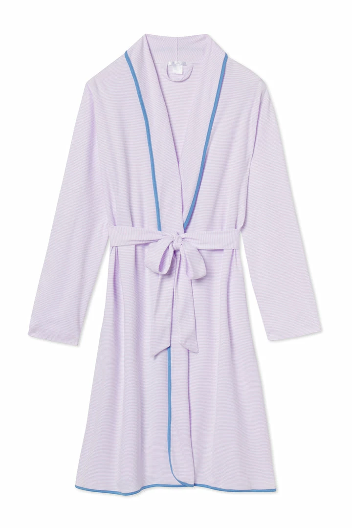The Pima Robe in Lavender Fields, a soft purple micro stripe with cerulean blue trim, features long sleeves, a sewn-in belt, and side pockets. Made from 100% Pima cotton.