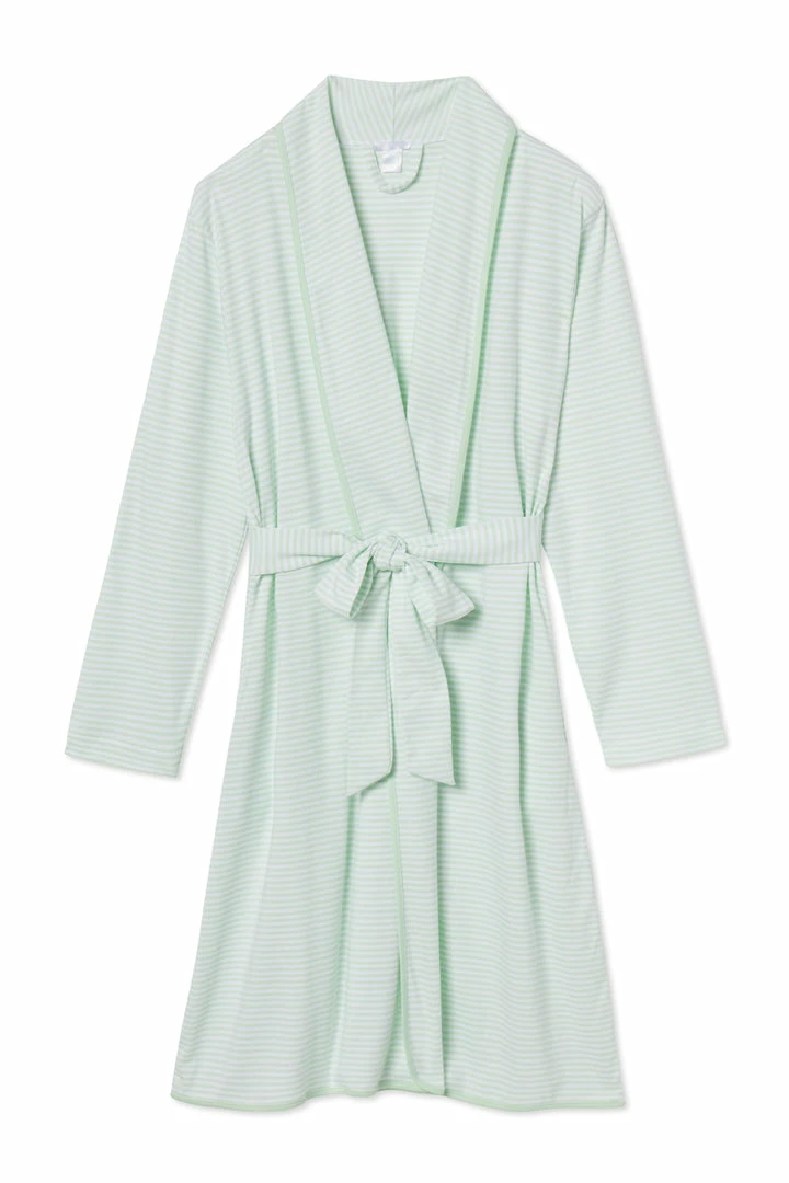 The Pima Robe in Mint, a mist green with white stripes and matching green trim, features long sleeves, a sewn-in belt, side pockets and just the right amount of stretch. Made from 100% Pima cotton.