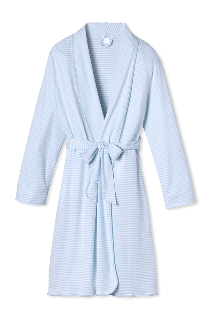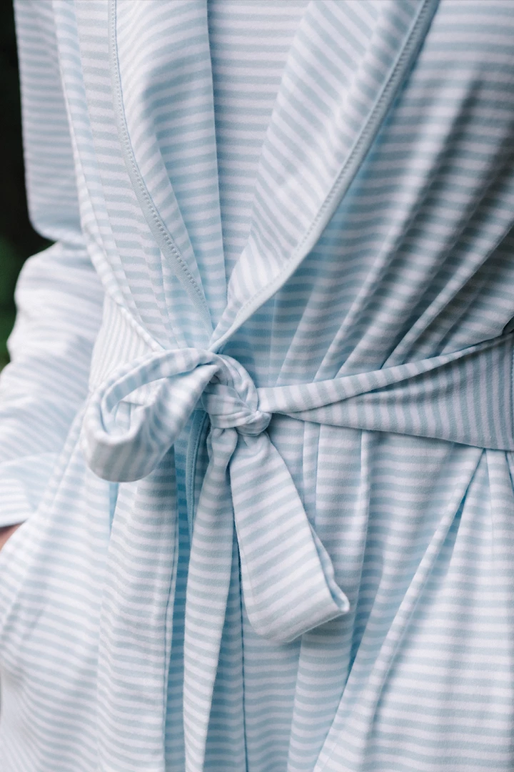 The Pima Robe in Porcelain, a soothing blue and white mini stripe with matching binding, features long sleeves, a sewn-in belt, and side pockets. Made from 100% Pima cotton.