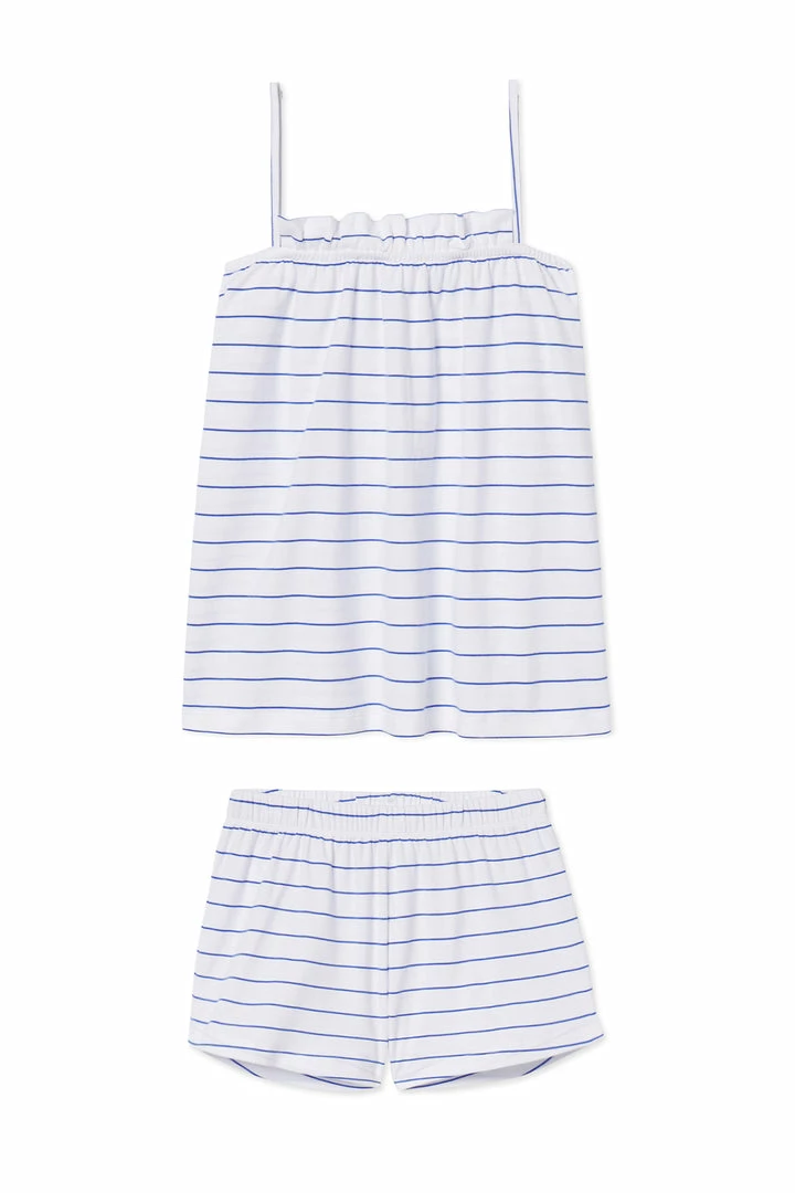 A little (ruffle) goes a long way in our softest set yet. This Cobalt shorts set is a blue and white stripe, with a feminine ruffle detail across the front, adjustable spaghetti straps and elastic waist shorts. Made from 100% Pima cotton.