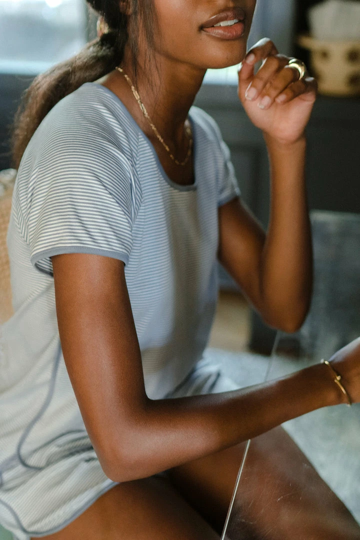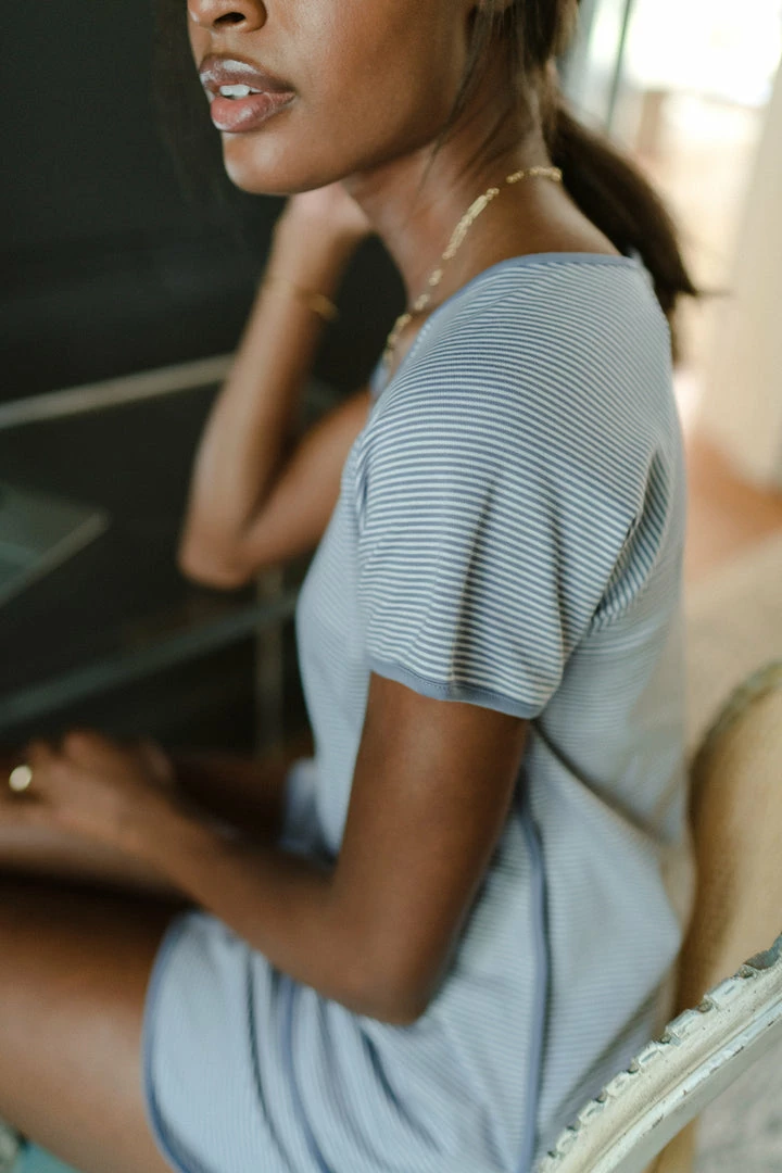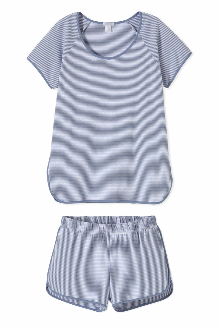 The Pima Shorts Set in Aura, a rich and dusky blue, features a short-sleeve scoop neck top and shorts with an elastic waistband. Made from 100% Pima cotton.