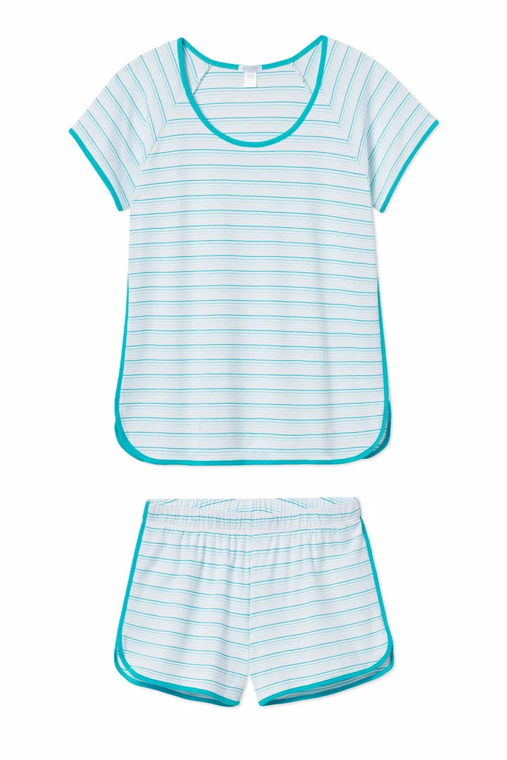 The Pima Shorts Set in Turquoise Ombre, a turquoise gradient stripe on white with coordinating binding, features a short-sleeve, scoop-neck top and shorts with an elastic waistband. Made from 100% Pima Cotton.