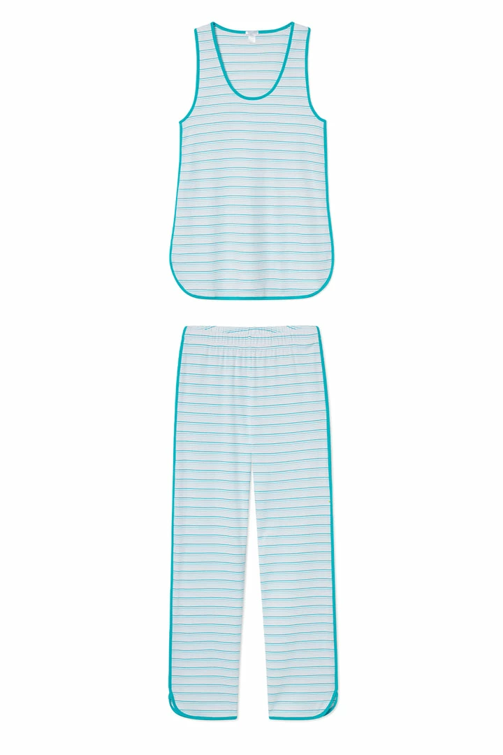 The Pima Tank-Long Set in Turquoise Ombre, a turquoise gradient stripe on white with coordinating binding, features a sleeveless scoop neck top and pants with an elastic waistband. Made from 100% Pima cotton.