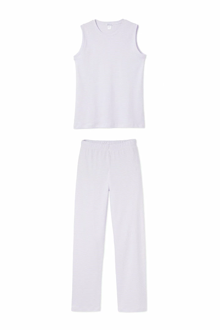The Tank-Long Weekend Set in Wisteria, a fresh, feminine, and subtly sweet lilac stripe, features a fitted, sleeveless crewneck top. The pants are high-waisted with an elastic waist and straight-edge hem. Made from 100% Pima cotton.