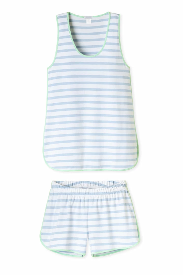 The Pima Tank-Short Set in Saltwater, a sun-faded light blue stripe with coordinating pale jade trim, features a sleeveless scoop neck top and shorts with an elastic waistband. Made from 100% Pima cotton.