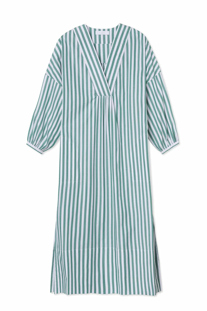 The Pocket Caftan in Balsam Stripe, bold, deep green, features a V-neck placket with gathering, a drop shoulder, topstitched pockets, and bracelet-length button sleeves. Side slits and an inverted pleat give movement to this versatile lounge piece. Made of 100% cotton poplin.
