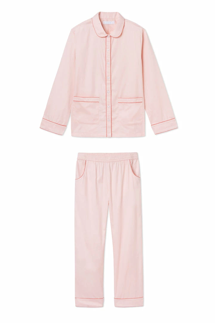 The Piped Pants Set in Peach, soft and sweet as the fruit it was named for, features a collared long-sleeve button-up top and pants with pockets and an elastic waist. Made of 100% cotton poplin.