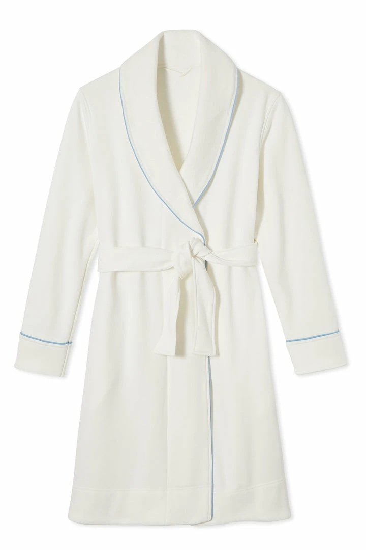 The Cozy Robe in French Blue, an ivory base with light blue trim, is heavier than our signature robes but with all the same great features — a sleek turndown collar, sewn-in belt, and roomy pockets. It’s lined in fleece with a soft cotton jersey exterior.
