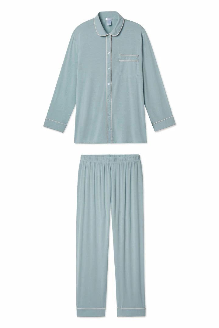 The DreamKnit Button Down Set in Plains, a soothing, sage green with peach piping, features a long-sleeve button-down top with a curved collar and chest pocket. Wide-leg pants with an elastic waistband are a perfect pairing. Made of 95% modal, 5% spandex.