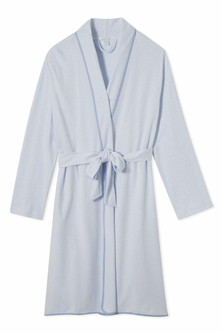 The Pima Robe in French Blue, a soft, striped shade inspired by Provençal ceramics, features long sleeves, a sewn-in belt, and side pockets. Made from 100% Pima cotton.
