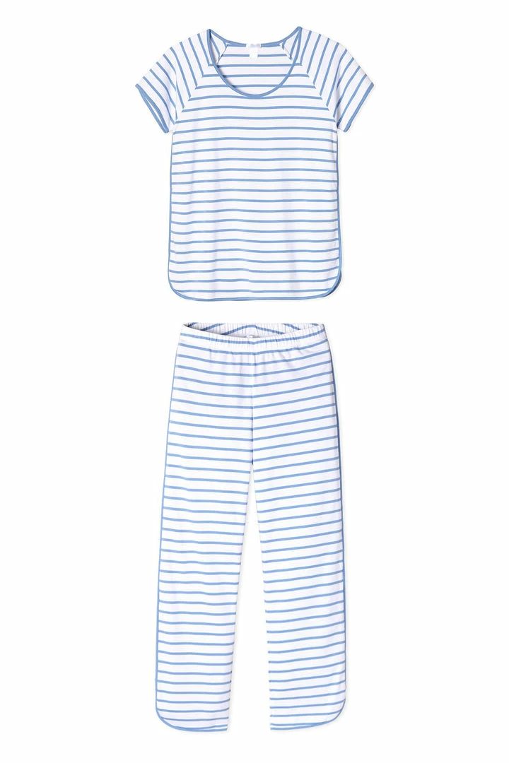 The Pima Short-Long Set in Bistro, a classic blue and white stripe, features a short-sleeve scoop neck top and pants with an elastic waistband. Made from 100% Pima cotton.