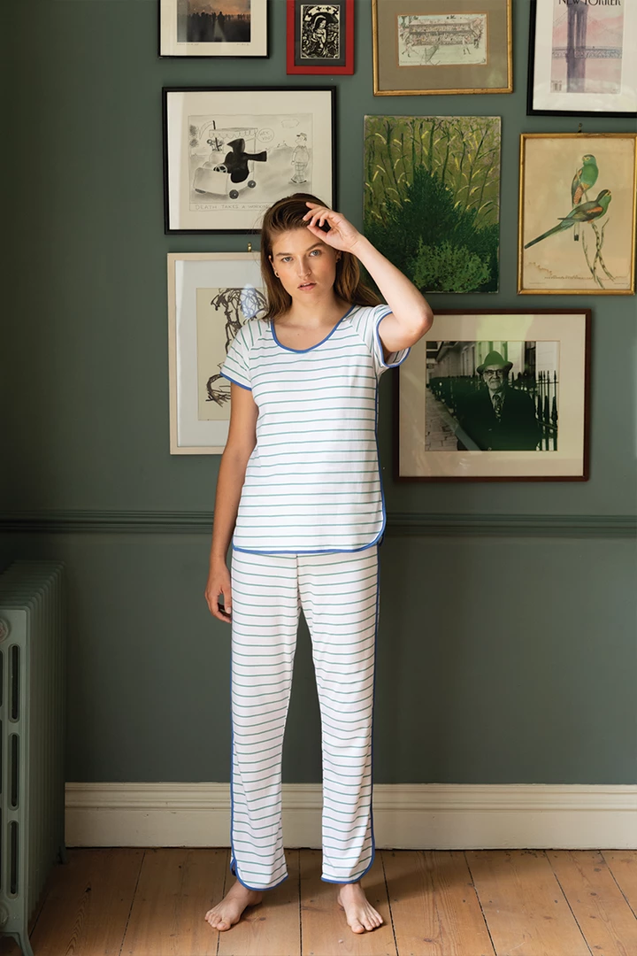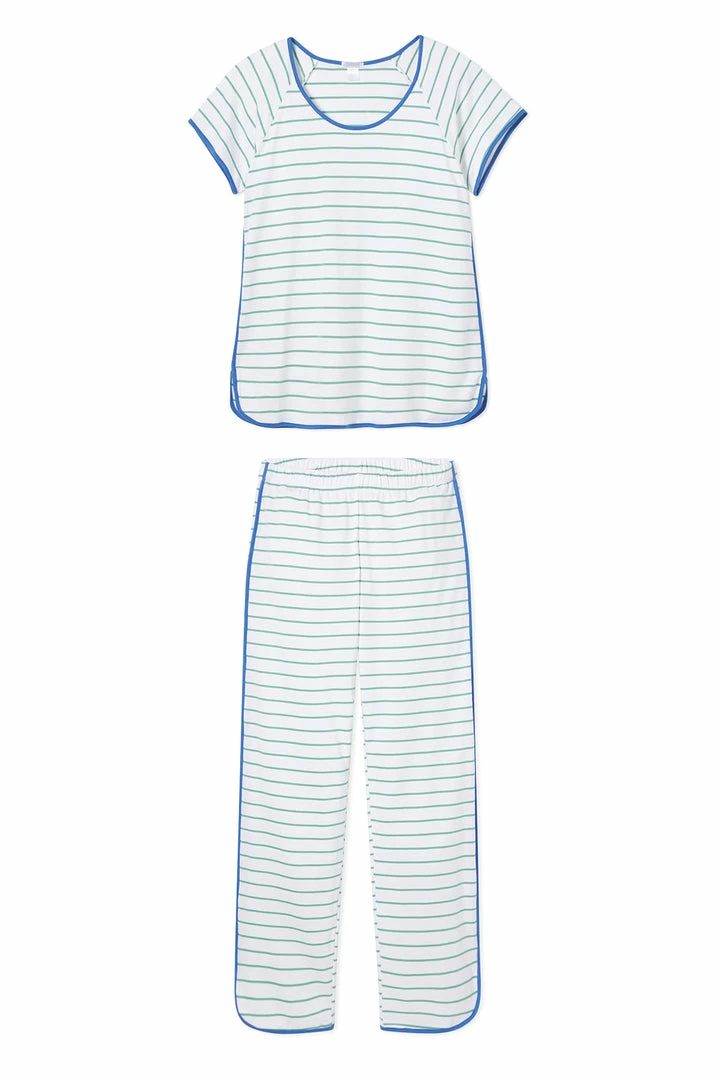 The Pima Short-Long Set in Pasture, a green stripe with a contrasting, true-blue trim, features a short-sleeve scoop neck top and pants with an elastic waistband. Made from 100% Pima cotton.