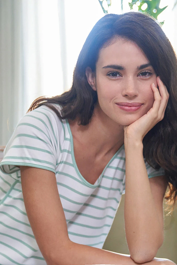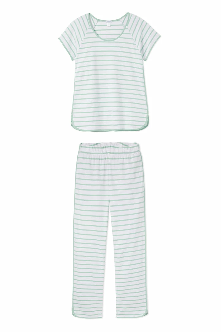 The Pima Short-Long Set in Spring Green, a fresh stripe reminiscent of the season’s new growth, features a short-sleeve scoop neck top and pants with an elastic waistband. Made from 100% Pima cotton.