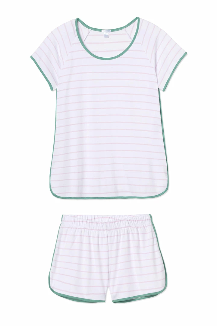 The Pima Shorts Set in Iris, a lavender stripe with contrast green piping, features a short-sleeve scoop neck top and shorts with an elastic waistband. Made from 100% Pima cotton.