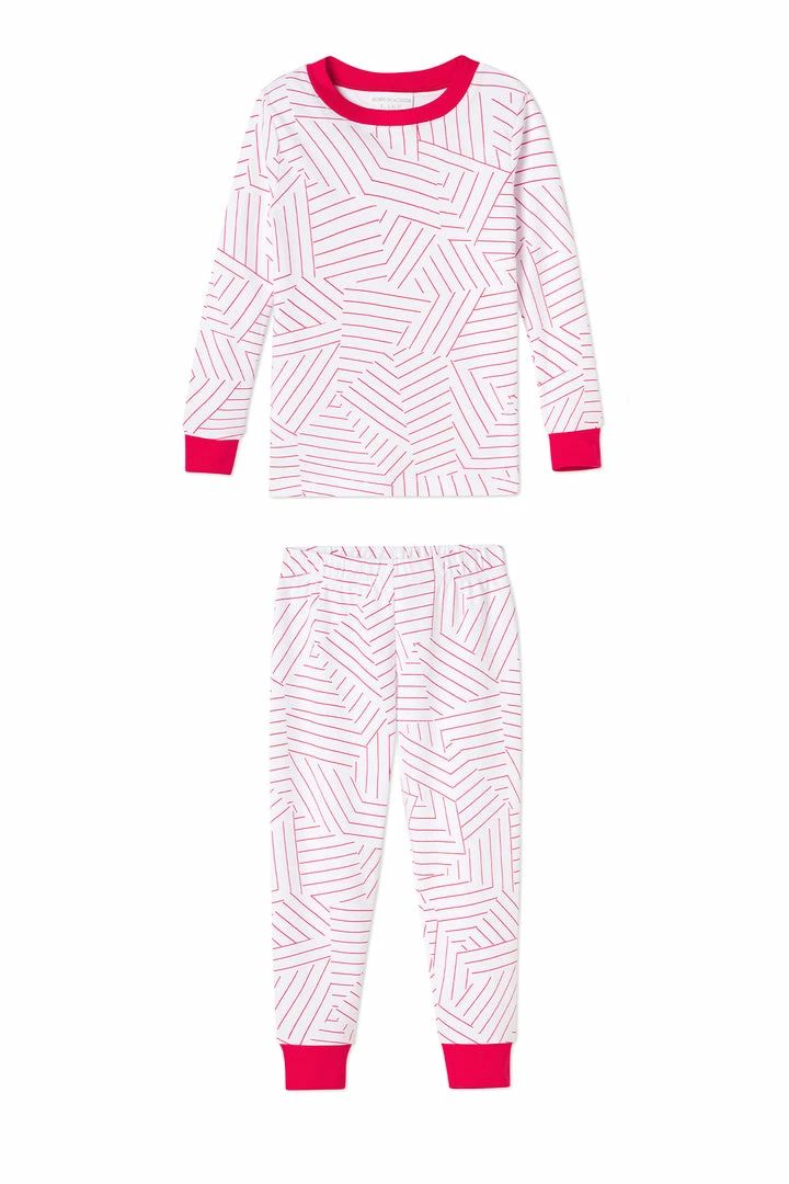 The Kids Long-Long Set in Schumacher’s Deconstructed Stripe in Red features a long-sleeve top and pants with an elastic waistband. Made from 100% Pima cotton. This garment is not flame resistant. For the child’s safety, this garment should fit snugly.