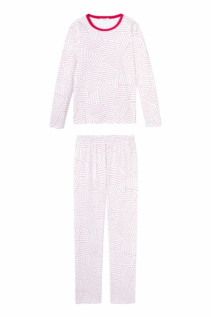 The Long-Long Weekend Set in Schumacher’s Red Deconstructed Stripe, a bold, graphic print with a saturated red binding, features a fitted, long-sleeve crewneck top. The pants are high-waisted with an elastic waist and straight-edge hem. Made from 100% Pima Cotton.