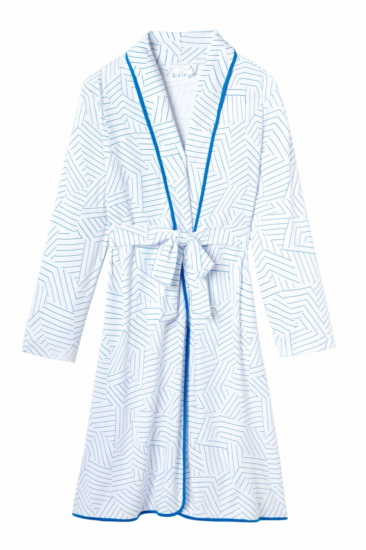 The Pima Robe in Schumacher’s Cobalt Deconstructed Stripe, a piercing, true-blue graphic print, features long sleeves, a sewn-in belt, and side pockets. Made from 100% Pima cotton.